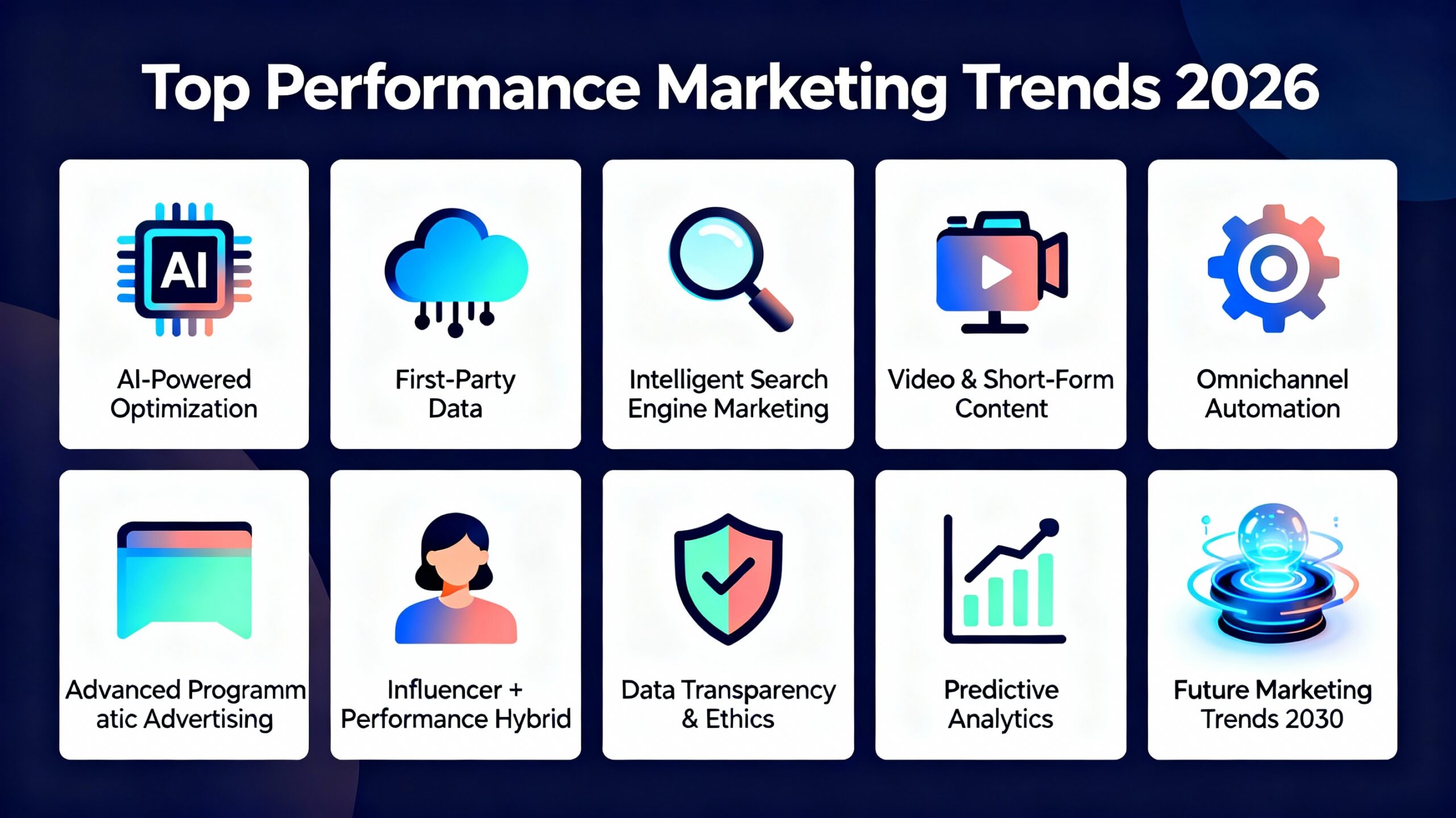 The top performance marketing trends for 2026 include AI-driven optimization, first-party data strategies, programmatic advertising, omnichannel automation, predictive analytics, and video-first performance campaigns. These trends help brands improve ROI, reduce acquisition costs, and offer a personalized customer experience.
